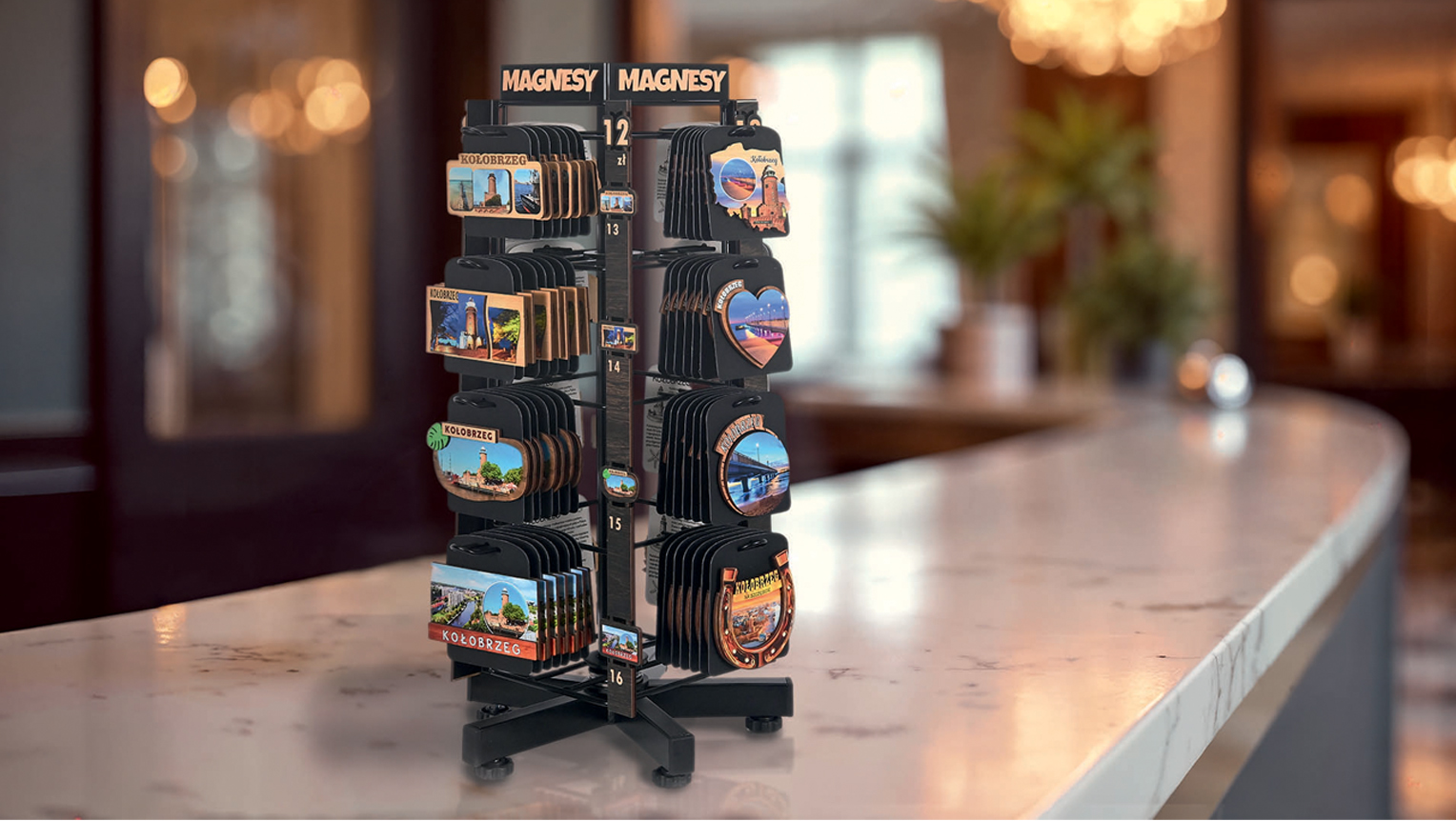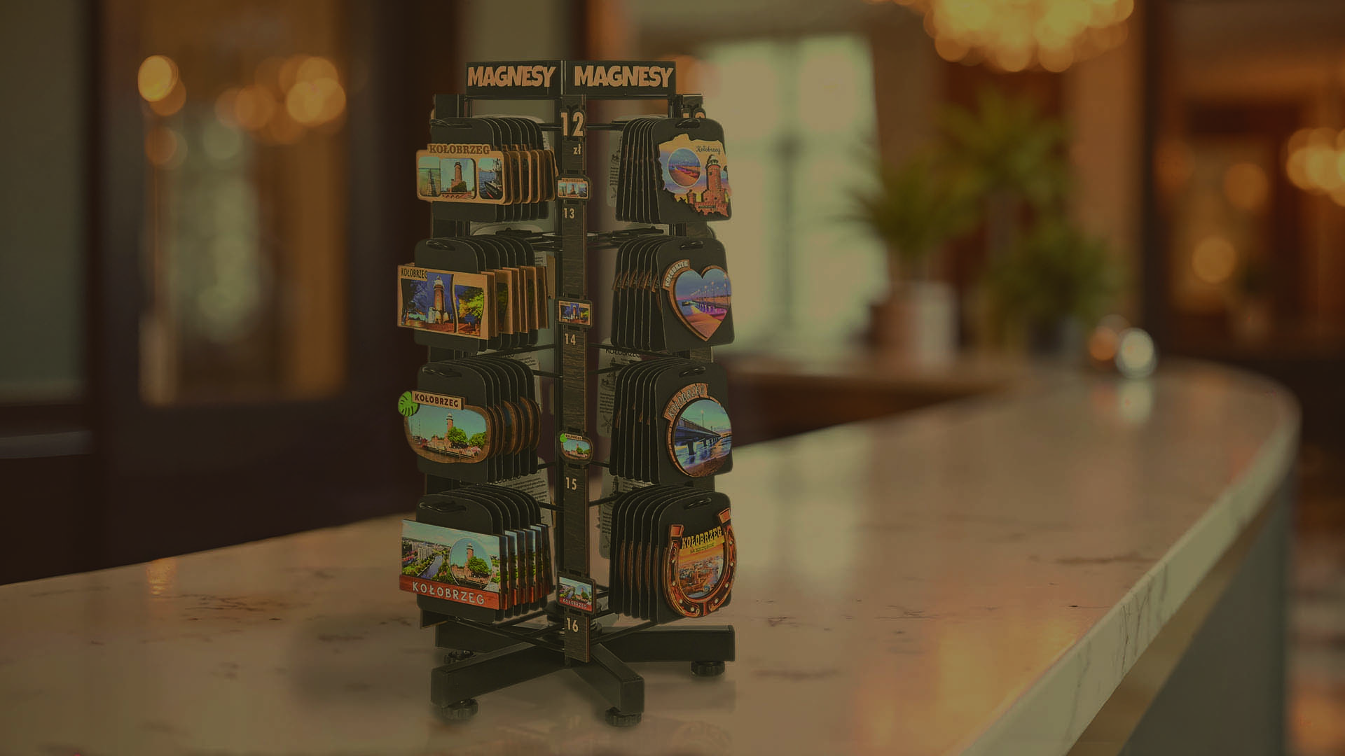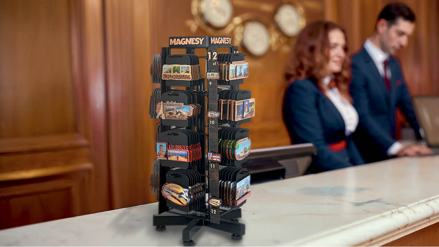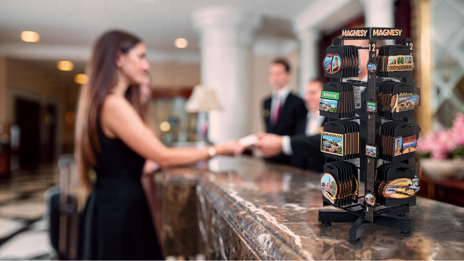 Pour la série hôtelière, nous avons conçu un nouveau présentoir léger et élégant, qui occupe peu d’espace tout en embellissant la réception de l’hôtel. Son design moderne, sa haute qualité et son style raffiné font de l’exposition d’aimants une partie intégrante du décor intérieur.